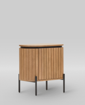 Its curved form and vertical teak paneling highlight the beauty of hand-finished wood, creating a warm and organic texture that complements both contemporary and minimalist interiors. The rounded corners and clean lines soften the structure, while black powder-coated metal legs add a bold contrast and dependable support.