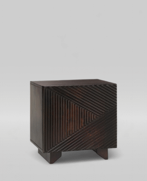 Made from premium real teak wood, the Nino Nightstand features a rich dark finish that highlights the depth and grain of the material. The eye-catching front panel is meticulously carved with diagonal lines forming dynamic patterns, making each unit a functional art piece. Behind the striking facade lies generous hidden storage, ideal for keeping personal items tucked away in style.